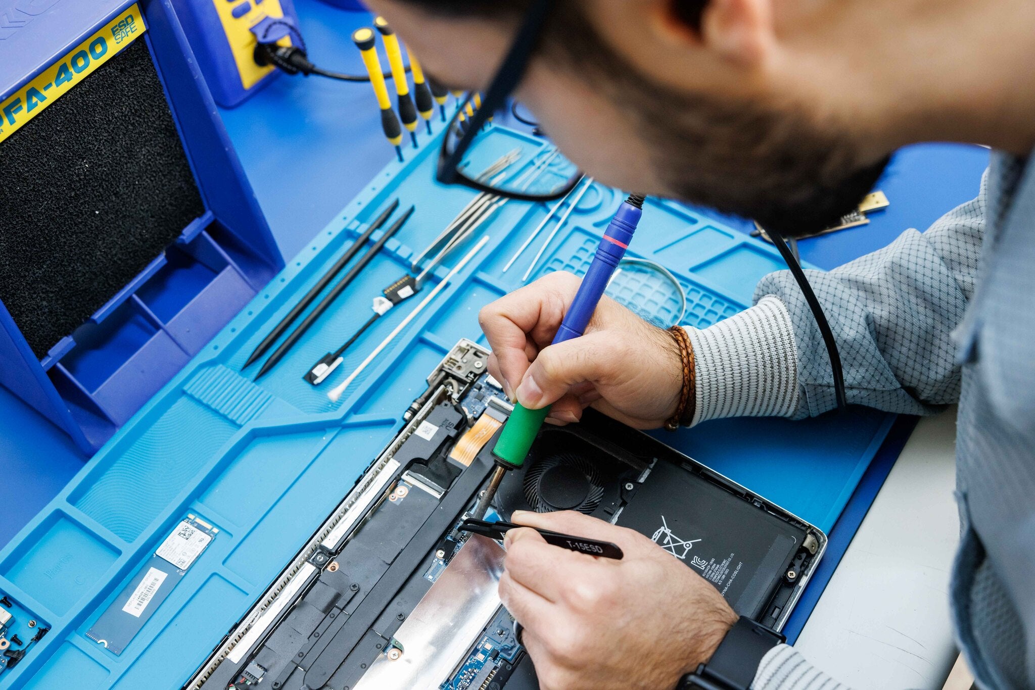 A used electronic device is placed on one of our 250+ test benches, where a qualified technician begins the assessment using our specially developed test protocols. After confirming that the device meets our standards, the technician tags it as "Quality Check Ready" and logs all pertinent data into our inventory system.